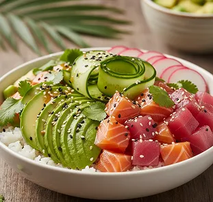 Create bliss with fish, rice, and toppings. Healthy and customizable.